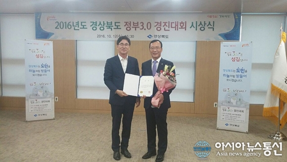 12일 이범용 경북 칠곡부군수(오른쪽)가 도청 사림실에서 열린 시상식에서 도지사상을 수상하고 있다.(사진제공=칠곡군청) 경북 칠곡군(군수 백선기)이 12일 도청 사림실에서 열린 '경상북도 정부3.0 우수사례 경진대회 시상식'에서 도지사 표창을 수상했다. '정부3.0 우수사례 ... 2016-10-13