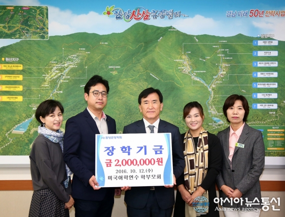 12일 제12기 중학생 미국어학연수·문화체험단 학부모회가 장학금을 기탁하고 있다.(사진제공=함양군청) 제12기 중학생 미국어학연수·문화체험단 학부모회가 12일 함양군청 군수실을 방문, 지역의 우수인재 육성에 써달라며 (사)함양군장학회(이사장 임창호 군수)에 장학금 200만원... 2016-10-13