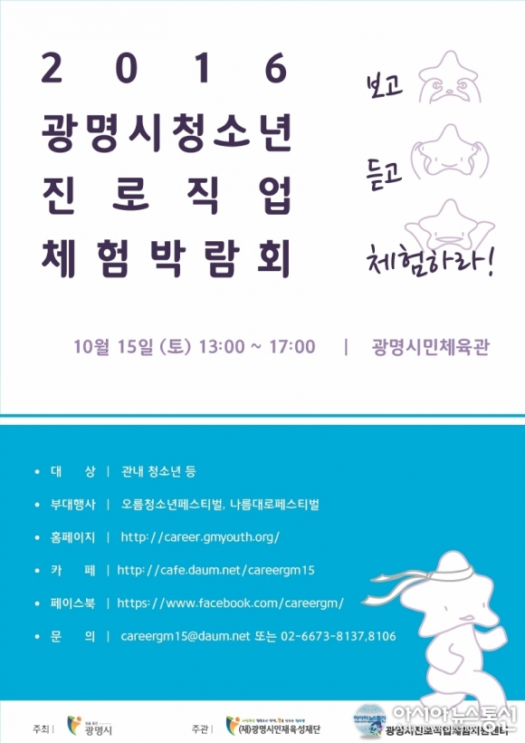 '광명 청소년 진로직업체험 박람회' 포스터.(사진제공=광명시청) 광명시 청소년들에게 진로탐색과 진로직업체험의 기회를 제공하기 위한 '2016년 광명시 청소년 진로직업체험박람회'가 오는 15일 오후1시부터 5시까지 광명시민체육관에서 열린다. 진로직업체험박람회 개회식에... 2016-10-12