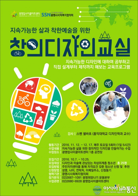 광명시는 소외계층 청소년을 위한 디자인 프로그램인 '지속가능한 삶을 위한 창의 디자인 학교(이하 지속가능한 디자인 학교)' 참가자를 모집한다고 12일 밝혔다.