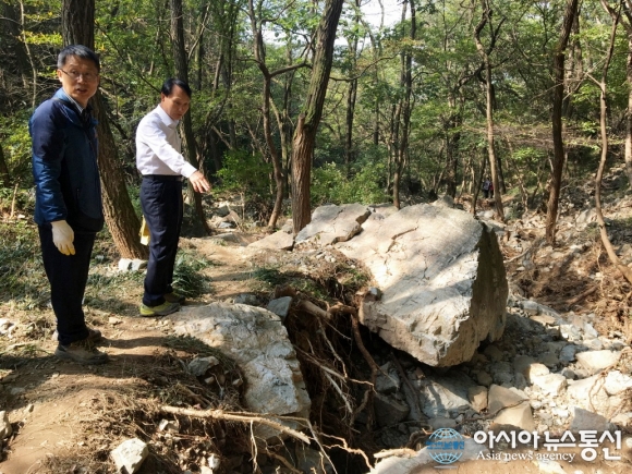 12일 신용수 의창구청장이 태풍 ‘차바’로 피해를 입어 복구작업이 한창인 용추계곡을 점검하고 있다.(사진제공=창원시청) 신용수 창원시 의창구청장은 12일 제18호 태풍 ‘차바’ 내습에 따라 등산로 유실, 교량 시설물 등이 훼손된 용추계곡 복구현장을 살피며 점검했다. 자... 2016-10-12