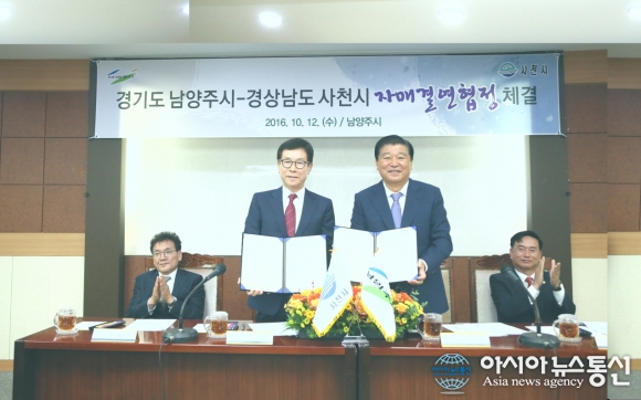 12일 경기도 남양주 시청에서 송도근 사천시장과 이석우 남양주시장이 ‘자매결연 협약식’을 갖고 있다.(사진제공=사천시청) 경남 사천시와 경기도 남양주시는 12일 오전 9시 남양주시청에서 송도근 사천시장과 이석우 남양주시장을 비롯해 양 지역 시의회 의장 간부공무원이 참석한... 2016-10-12