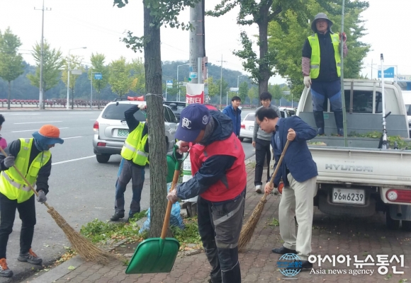 11일 경산시 진량읍사무소 직원들과 환경미화원들이 주요도로변에 가로수로 식재돼 있는 은행나무 열매수확 및 수거에 나서고 있다.(사진제공=경산시청) 경북 경산시 진량읍(읍장 신기태)은 11일 읍사무소 직원들과 환경미화원 13명이 참여해 주요도로변에 가로수로 식재돼 있는 은행나무 ... 2016-10-12