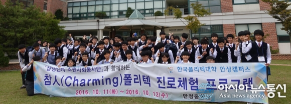 11일과 12일 한국폴리텍대학 경기 안성캠퍼스(학장 김명희)는 만정중학교 1학년 학생 261명을 대상으로 ‘참人(Charming) 폴리텍 진로직업체험’ 프로그램을 운영했다.(사진제공=안성캠퍼스) 한국폴리텍대학 경기 안성캠퍼스(학장 김명희)는 11일과 12일 만정중학교 1학년 학생 261명을 대상... 2016-10-12