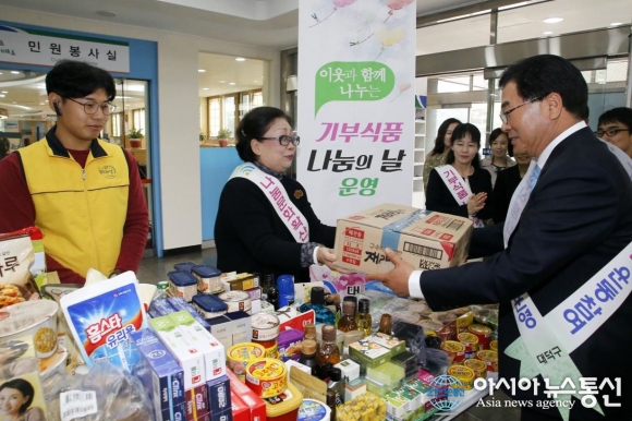 박수범 대덕구청장이 ‘기부식품 나눔의 날’ 운영 행사에서 기부식품을 전달하고 있다.(사진제공-대덕구청) 대전 대덕구(구청장 박수범)는 12일 구청 현관에서 저소득층을 위한 식품이나 생필품을 푸드마켓에 기부하는 일상 속 나눔문화 실천을 ... 2016-10-12