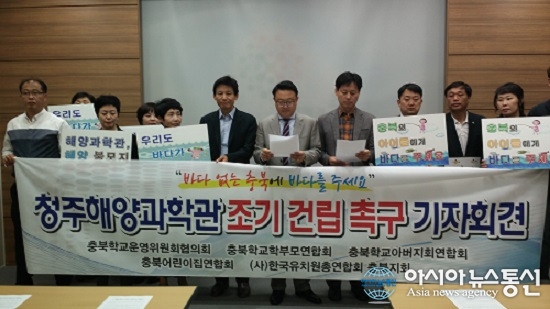 12일 충북 학교운영협의회 등 5개 학부모단체 회원들이 충북도청 브리핑실에서 청주해양과학관 조기 건립을 촉구하는 기자회견을 열고 있다./아시아뉴스통신=백운학 기자 충북지역 학무모 단체들이 충북 청주해양과학한 건립을 촉구했다. 학교운영위 협의회등 충북 5개 학부모 단체는 12... 2016-10-12