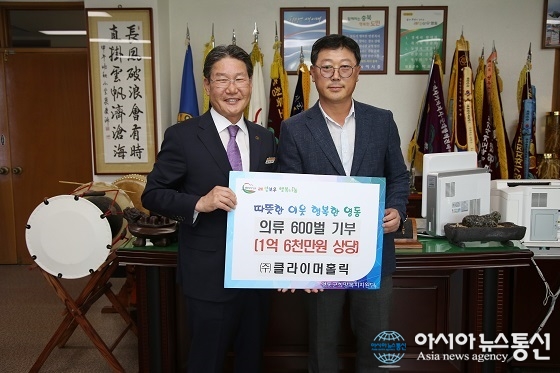 12일 충북 영동에 둥지를 튼 아웃도어 브랜드 (주)클라이머홀릭 조영환 대표(오른쪽)가 영동군청을 방문해 관내 저소득 주민들에게 전해달라며 박세복 군수에게 가을용 자켓 600벌(1억6000만원 상당)을 기부한 뒤 기념촬영하고 있다.(사진제공=영동군청) 아웃도어 브랜드 (주)클라이머홀릭(대... 2016-10-12