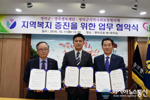 11일 이희진 경북 영덕군수(가운데)와 편창범 경북행복재단 대표이사(오른쪽), 이용우영덕군지역사회보장협의체 민간위원장이 영덕군청에서 '지역사회복지 증진 공동 노력'을 담은 업무협약을 맺고 있다.(사진제공=영덕군청) 경북 영덕군(군수 이희진)이 경북행복재단(대표이사 편창... 2016-10-12