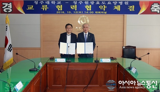 12일 충북 청주대학교 정성봉 총장(오른쪽)과 청주원광효도요양병원 오성배 병원장이 청주대에서 교류협력 협약을 한 뒤 기념촬영 했다.(사진제공=청주대학교) 충북 청주대학교(총장 정성봉)와 청주원광효도요양병원(병원장 오성배)이 교육 및 연구분야 등에서 상호 협력하기로 협약했다. ... 2016-10-12
