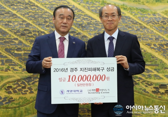 11일 계명대 (재)1%사랑누기에서 경주 지진 피해 복구를 위해 성금을 전달하고 있다. 왼쪽 최양식 경주시장, 오른쪽 김용일 계명대 학생부총장.(사진제공=계명대) 계명대학교(총장 신일희)가 최근 잇따른 자연재해 피해를 입은 지역의 복구를 위해 힘을 모았다. 계명대 (사)1%사랑나누기는 ... 2016-10-12