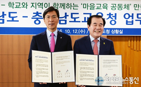 12일 충남도청 상황실에서 안희정 지사(왼쪽)와 김지철 교육감이 충남형 마을교육 공동체 실현을 위한 업무협약을 체결하고 있다.(사진제공=충남도청) 충남도와 충남도교육청이 ‘학교와 지역이 함께 하는 마을교육 공동체’를 만들기 위해 손을... 2016-10-12