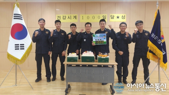 11일 전남경찰청 501의무경찰대가 건강시계 1000일 달성 기념식을 가졌다.(사진제공=전남경찰청) 전남경찰청 501의무경찰대(중대장 홍승우)는 11일 건강시계 1000일 달성 기념식을 가졌다. 건강시계는 의무위반 행위 발생이 없는 날을 기록하는 것으로 이번 501의무경찰대에서는 1000일을 달성... 2016-10-12