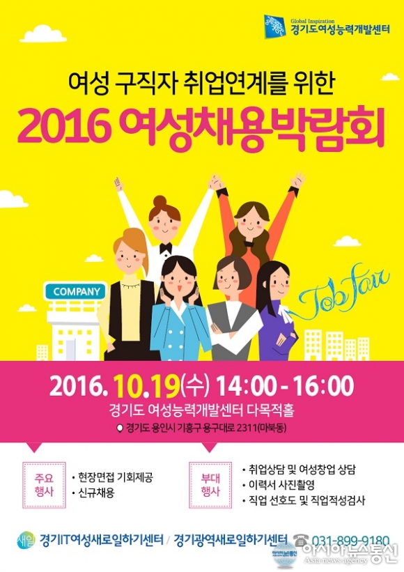 경력단절 여성을 위한 '2016 여성채용박람회에서는 면접을 위한 이력서 컨설팅, 무료 사진촬영 등의 서비스도 제공된다.(사진제공=경기도청) 경력단절 여성을 위한 여성채용박람회가 19일 오후 용인시 마북동에 있는 센터 내 다목적홀에서 열린다. 경기도여성능력개발센터(소장 조정옥)... 2016-10-12