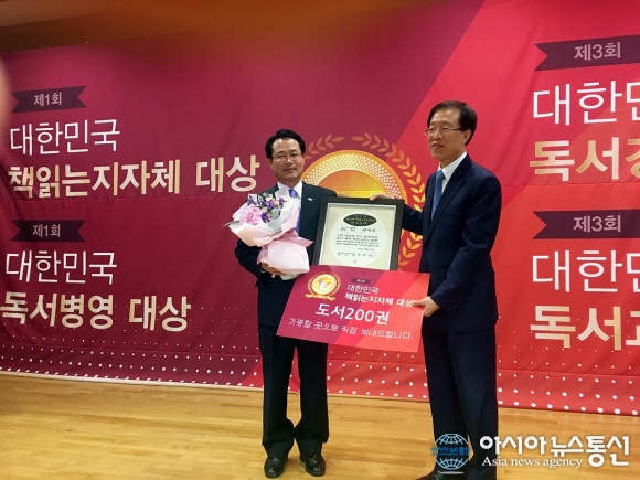 11일 서울 충무아트홀 컨벤션센터에서 열린 '제1회 대한민국 책 읽는 지자체' 시상식에서 윤위영 경북 영덕부군수(왼쪽)가 이석연 (사)국민독서문화진흥회 운영위원장(전 법제처장)으로부터 '지자체 대상'을 수상한 후 기념촬영을 하고 있다.(사진제공=영덕군청) 경북 영덕군(군... 2016-10-12