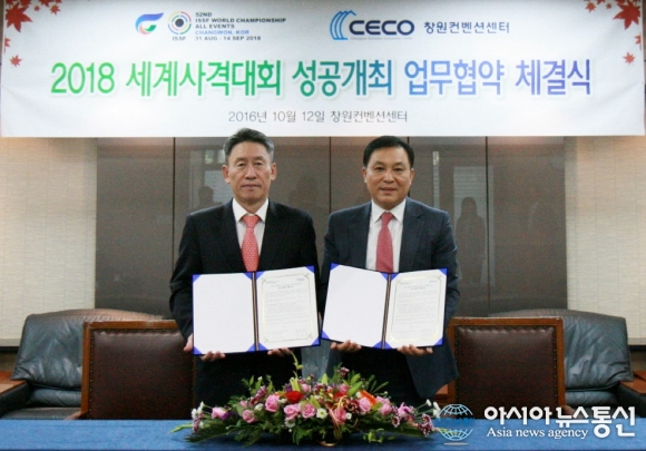 12일 CECO VIP룸에서 ‘2018창원세계사격선수권대회’ 조직위원회와 창원컨벤션센터 사업단이 체결한 ‘사격대회 성공 개최를 위한 업무협약서’를 보이며 기념촬영 모습.(왼쪽)이병국 사격대회 조직위원회 사무총장,(오른쪽)김호남 CECO사업단 단장.(사진제공=창원시청) ‘2018... 2016-10-12