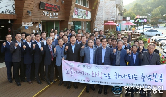 11일 김병찬 한국농어촌공사 충남지역본부장(오른쪽 네번째)을 비롯해 공주동학사에서 진행된 노사 한마음워크숍 참석자들이 기념촬영을 하고 있다.(사진제공=한국농어촌공사 충남본부) 한국농어촌공사 충남지역본부는 11일 공주 동학사에서 ‘소통... 2016-10-12