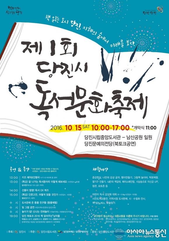 충남 당진시가 오는 15일 처음 개최하는 '제1회 당진시독서문화축제' 포스터.(사진제공=당진시청) 충남 당진시는 독서의 계절인 가을을 맞아 오는 15일 시립중앙도서관과 남산공원, 문예의전당 일원에서 제1회 당진시 독서문화 축제를 개최한다고 12일 ... 2016-10-12