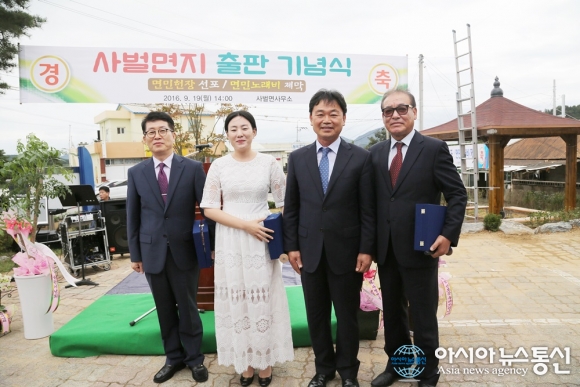 19일 경북 상주시 사벌면사무소 전정에서 열린 '사벌면지 출판기념회및 면민헌장 선포.면민노래비 제막식'에서 안희성 사벌면장(오른쪽 두 번째)이 홍흥구 교장, 소프라노 이기업 씨, 정영진 사벌면발전협의회장(왼쪽부터) 등에게 감사패를 전달하고 있다. /아시아뉴스... 2016-09-19