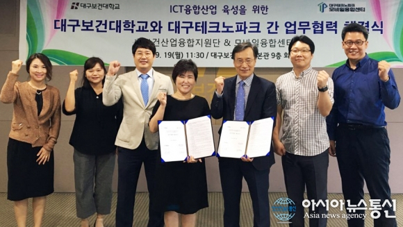 19일 오전 대구보건대 본관 소회의실에서 대구보건대 보건산업융합지원단과 대구테크노파크 모바일융합센터가 ICT융합산업 육성을 위한 업무협약을 체결한 후 기념촬영을 하고 있다. 왼쪽 3번째부터 김병곤 센터장, 이유정 단장, 최석권 센터장.(사진제공=대구보건대) ... 2016-09-19