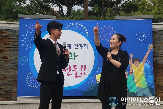 19일 충북대학교 사범대학이 개신문화관 지하광장에서 축전 전야제인 ‘스승과 스승 뭔들!’을 진행한 가운데 김보림 사범대학장(오른쪽)이 박현규 사범대 학생회장과 함께 노래를 부르고 있다.(사진제공=충북대학교) 충북대학교(총장 윤여표) 사... 2016-09-19