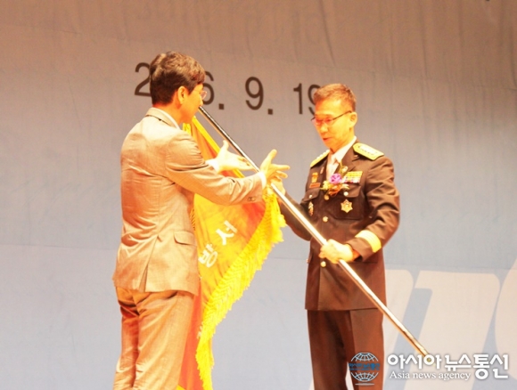 19일 안희정 지사가 이규선 초대 계룡소방서장에게 서기를 수여하고 있다./아시아뉴스통신=전철세 기자 “안전한 계룡, 행복한 충남. 계룡소방서가 지켜내겠습니다.” 계룡시민의 안전을 책임질 계룡소방서가 19일 오후 3시 계룡문화예술의전당... 2016-09-19
