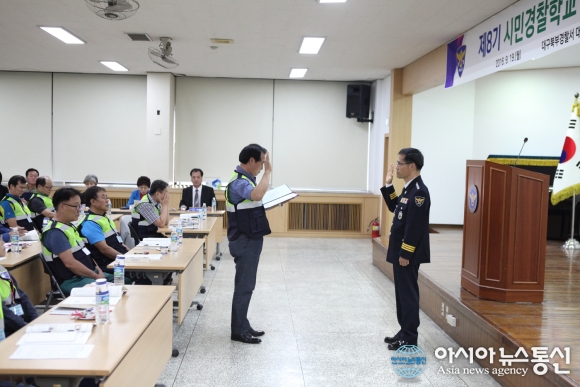 19일 대구북부경찰서 4층 강당에서 '제8기 시민경찰학교' 입교식이 열리고 있다.(사진제공=대구북부경찰서) 대구북부경찰서(서장 최석환)는 19일 오후 경찰서 4층 강당에서 경찰서장을 비롯한 각 과장, 지구대장 등 경찰관과 시민명예경찰 8기 교육생 30명, ... 2016-09-19