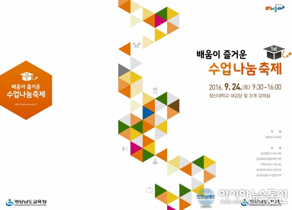 경남도교육청이 주최해 여는 ‘제1회 배움이 즐거운 수업 나눔 축제’ 리플릿.(사진제공=경남교육청) 경남도교육청(교육감 박종훈)은 오는 24일 창신대학교 대강당과 강의실에서 ‘제1회 배움이 즐거운 수업 나눔 축제’를 개최한다. 올해 처음 열리는 이번 축제는 중?고등학... 2016-09-19