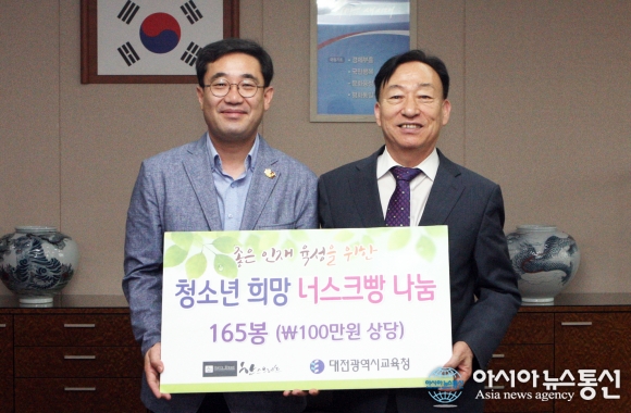 19일 대전시교육청은 한스브레드로부터 너스크 빵 156봉을 기탁 받았다. 사진은 한송철 한스브레드 대표(왼쪽)와 설동호 대전시교육감의 모습.(사진제공=대전시교육청) 대전시교육청(교육감 설동호)이 19일 한스브레드(대표 한송철)로부터 너스크 빵 156봉(100만원 상당)을 기탁 받았다. 이번... 2016-09-19