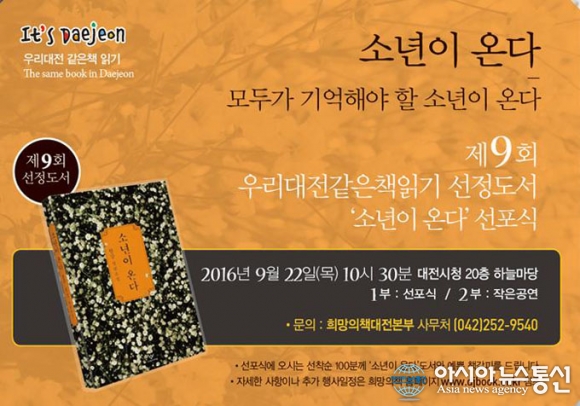 우리대전 같은 책 읽기 선정도서 선포식 웹자보./아시아뉴스통신DB 대전시가 23개 공공도서관, 우리대전 같은 책 읽기 네트워크와 함께 오는 22일 대전시청 20층 하늘 마당에서 ‘제9회 우리대전같은책읽기 선정도서 - 소년이 온다’ 선포식 행사를 개최한다. 19일 시에 따르면 이날 ... 2016-09-19