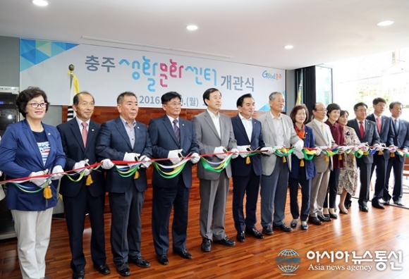 19일 충북 충주생활문화센터에서 센터 개관식이 열린 가운데 조길형 충주시장(왼쪽 다섯 번째), 이종갑 충주시의회 의장(왼쪽 여섯 번째) 등 참석한 관계자들이 테이프커팅을 하고 있다.(사진제공=충주시청) 충북 충주시민들의 열린 문화공간인 충주생활문화센터가 19일 개관하고 본격적인 ... 2016-09-19