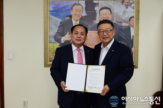 19일 음성군청 상황실에서 음성군과 전문건설공제조합 기술교육원(원장 박근주)이 지역발전과 건설기술인력 양성 업무협약을 맺은 가운데 이필용 군수(오른쪽)와 박 원장이 기념촬영을 했다.(사진제공=음성군청) 충북 음성군이 19일 전문건설공제조합 기술교육원(원장 박근주)과 지역발전과 건설기술인... 2016-09-19