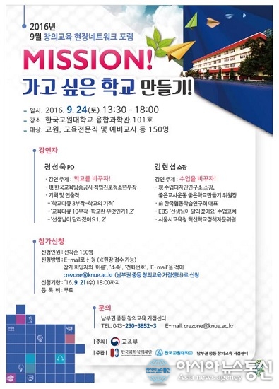 오는 24일 한국교원대학교 창의교육거점센터가 개최하는 2016년 9월 창의교육 현장네트워크 포럼 포스터.(사진제공=한국교원대학교) 한국교원대학교(총장 류희찬)는 오는 24일 교내 융합과학관(101호)에서 2016년 9월 창의교육 현장 네트워크 포럼 ‘MISSION... 2016-09-19
