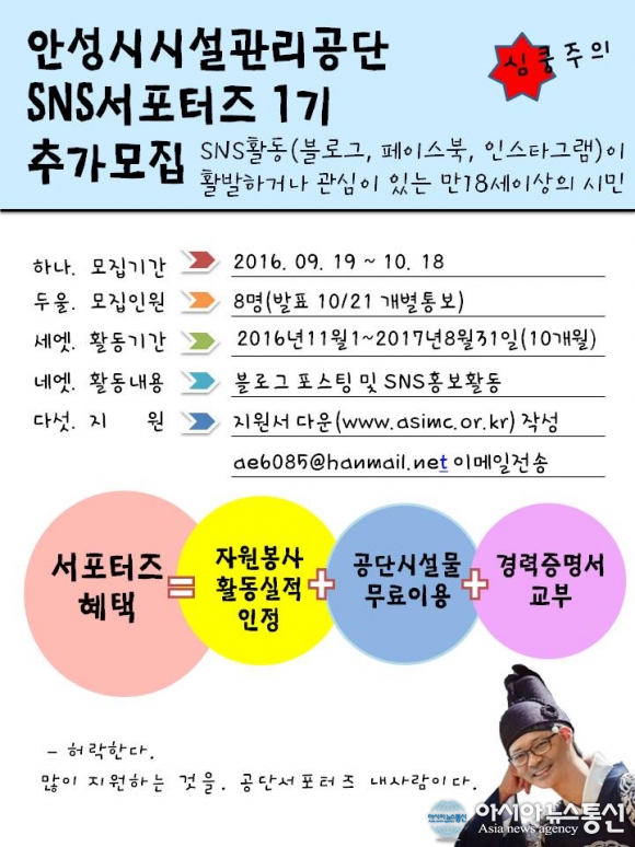 안성시설관리공단 SNS 서포터즈 모집 홍보 포스터.(사진제공=안성시청) 경기 안성시시설관리공단(이사장 박상기)은 다음달 18일까지 ‘공단SNS서포터즈 1기’를 추가모집 한다. 19일 공단에 따르면 공단 SNS서포터즈는 블로그, 페이스북, 인스타그램... 2016-09-19