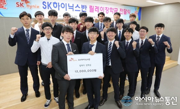 19일 영진전문대학 SK하이닉스반 2학년 재학생들이 장학금을 전달받고 선배인 김동영씨(앞줄 패널 왼쪽)와 함께 파이팅을 외치며 단체사진을 찍고 있다.(사진제공=영진전문대학) 기업맞춤형 협약반을 통해 대기업 취업에 성공한 전문대학 졸업자들이 취... 2016-09-19
