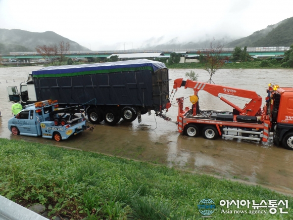 지난 17일 경북 청도군 청도읍 청도천 고수부지 주차장에서 중앙파출소 직원들이 연락이 두절된 대형차량을 견인 조치하고 있다.(사진제공=청도경찰서) 경북 청도경찰서(서장 양시창) 중앙파출소가 침수 직전 화물차량을 긴급 견인해 침수 피해를 방지했... 2016-09-19