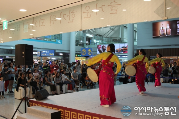 지난 14일 인천공항 3층 출국장 내 한국전통문화센터에서 외국인 여객들이 장구춤 등 전통문화 공연을 관람하고 있다.(사진제공=인천공항) 인천국제공항공사(사장 정일영)는 지난 13일부터 18일까지 추석 연휴 기간에 인천국제공항을 이용한 여객이 지난... 2016-09-19