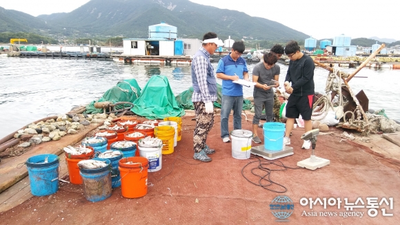지난 12일 폭염으로인한 하동군 양식장 피해 현황을 조사중인 장면.(사진제공=하동군청) 지난달 12일∼27일 폭염으로 인해 연안 수온이 30℃까지 상승하는 등 전례 없는 ‘이상 고수온 현상’이 지속되면서 하동지역 일부 양식장에서 우럭·넙... 2016-09-19