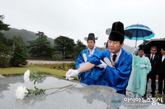 18일 강석진 국회의원이 함양군 서하면 황암사에서 황석산성순국선열추모위원회 주관으로 봉행한 ‘제419주년 황석산성 추모제’에서 헌화하고 있다./아시아뉴스통신=김상문 기자 경남 함양군 서하면 황암사에서 황석산성순국선열추모위원회(위... 2016-09-19