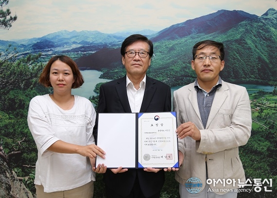 지난 7일 괴산군 일자리허브센터가 대통령직속 지역발전위원회의 지역행복생활권평가에서 ‘청주권 일자리중심 허브센터 운영’ 사업 우수사례로 선정돼 표창을 받은 가운데 김창현 군수 권한대행(가운데) 등이 기념촬영을 했다.(사진제공=괴산군청) ... 2016-09-19