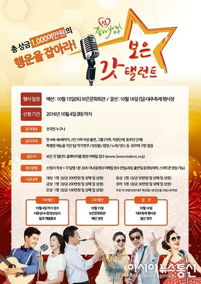 충북 보은군이 2016년 보은대추축제에서 진행하는 서바이벌 오디션 ‘보은갓탤런트’의 홍보 포스터.(사진제공=보은군청) 충북 보은군의 2016년 보은대추축제가 관광객과 함께하는 문화행사로 거듭난다. 이에 따라 전국의 재능과 끼를 가진 사람... 2016-09-19