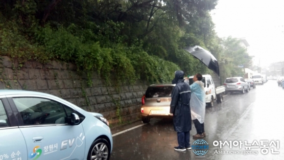 17일 ‘제16호 태풍 말라카스’의 영향으로 내린 집중호우 속에 비상근무에 들어간 창원시 의창구가 재해 위험지 점검에 나서고 있다.(사진제공=창원시청) 경남 창원시 의창구(구청장 신용수)는 ‘제16호 태풍 말라카스’의 영향으로 쏟아진 ... 2016-09-18