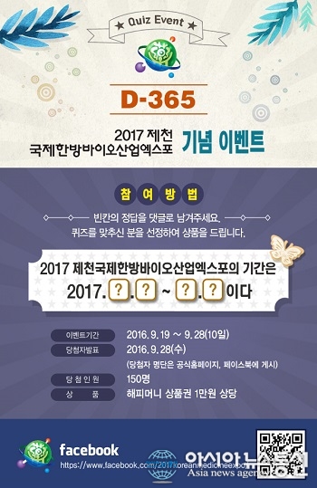 제천한방엑스포 D-365기념 이벤트 포스터.(사진제공=충북도청) 2017제천국제한방바이오산업엑스포 조직위원회는 엑스포 D-365를 맞아 페이스북에서 퀴즈 이벤트를 개최한다고 18일 밝혔다. 이 이벤트는 오는 28일까지 10일간 공식페이스북을 통해 참여할 ... 2016-09-18