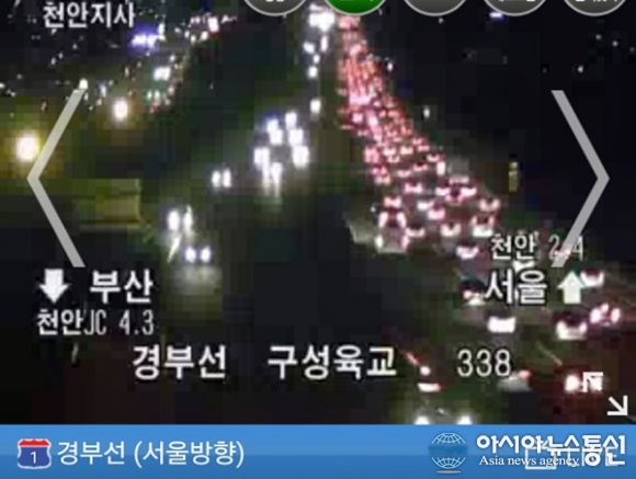 경부고속도로 서울방향 천안나들목 교통상황.(사진출처=한국도로공사 CCTV) 추석 연휴 4일차인 17일 전국 각지에서 명절을 보내고 귀가하는 차량들이 서둘러 고속도로에 진입하고 있다. 하지만 귀가 길 안전이 확보되지 않으면 사고로 이어질 수도 있어 운... 2016-09-17
