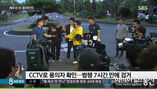 17일 오후, 제주시 연동에 있는 한 성당에서 신도 김모(61.여)씨를 흉기로 흉부와 복부를 4차례 찌르고 달아난 혐의로 긴급체포된 A씨가 경찰서로 압송되고 있다.(사진출처=SBS뉴스 캡처) 성당 안에서 60대 여성을 흉기로 찌르고 달아난 중국인이 범행 7시간... 2016-09-17