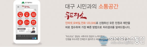 대구시 두드리소 홈페이지 캡처. 대구시는 전국 최초로 구축한 민원·제안·콜 통합시스템 '두드리소'가 올해 8월까지 9321건의 민원을 접수·처리했다고 밝혔다. 이는 지난해 같은 기간의 6703건과 비교해 2618건(39.1%)이 증가한 것으로, 단일... 2016-09-16