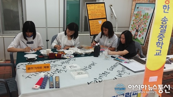 지난 13일 충북 청주 송절중학교 ‘캘리플래닛’ 동아리학생들이 학교축제인 송절제에서 ‘당신의 꿈을 써 드립니다’란 체험코너를 운영하고 있다.(사진제공=청주교육지원청) 자신들이 쓴 캘리그라피 작품을 판매해 수익금을 이웃사랑 성... 2016-09-16