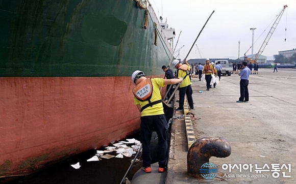 15일 경북 포항해경과 해양환경관리공단, 방제업체 관계자들이 포항신항에 정박 중인 화물선 T호의 기름유출 사고 관련 긴급 방제작업을 펼치고 있다.(사진제공=포항해경) 경북 포항신항에 정박 중이던 화물선 T호(1545톤 제주선적)의 기름탱크가 균열되면... 2016-09-15