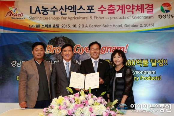 임창호 함양군수(가운데 왼쪽)가 LA농수산엑스포에서 체결한 수출계약서를 보이고 있다.(사진제공=함양군청) 지난해 10월 미국 서부시장개척활동으로 1700만 달러의 수출계약을 체결하는 큰 성과를 거둔 함양군이 올 가을에도 글로벌 무대 도약을 위해 북... 2016-09-14