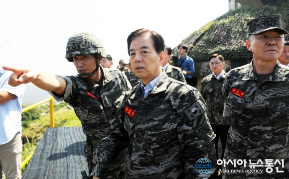 14일, 한민구 국방장관은 최북단 백령도를 방문해 군의 대비태세를 확인하고 장병들의 정신무장과 완벽한 임무수행을 당부했다. 한민구 국방부장관이 해병6여단을 순시하고 있다.(사진제공=국방부) 2016-09-14