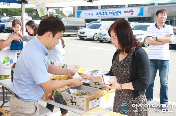 13일 경북 칠곡군청 전정에서 열린 지역 농산물 직판 행사에서 한 직원이 과일을 구매하고 있다.(사진제공=칠곡군청) 경북 칠곡군은 13일 군청 전정에서 추석을 맞아 가진 지역 우수농특산물 직판행사에서 2000여만 원의 매출을 올렸다고 14일 밝혔다. 이... 2016-09-14